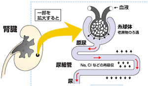 腎臓は濾紙にあたる“糸球体”で老廃物をろ過し、尿細管で必要なものは再吸収するため正常なら尿蛋白はごくわずかです。